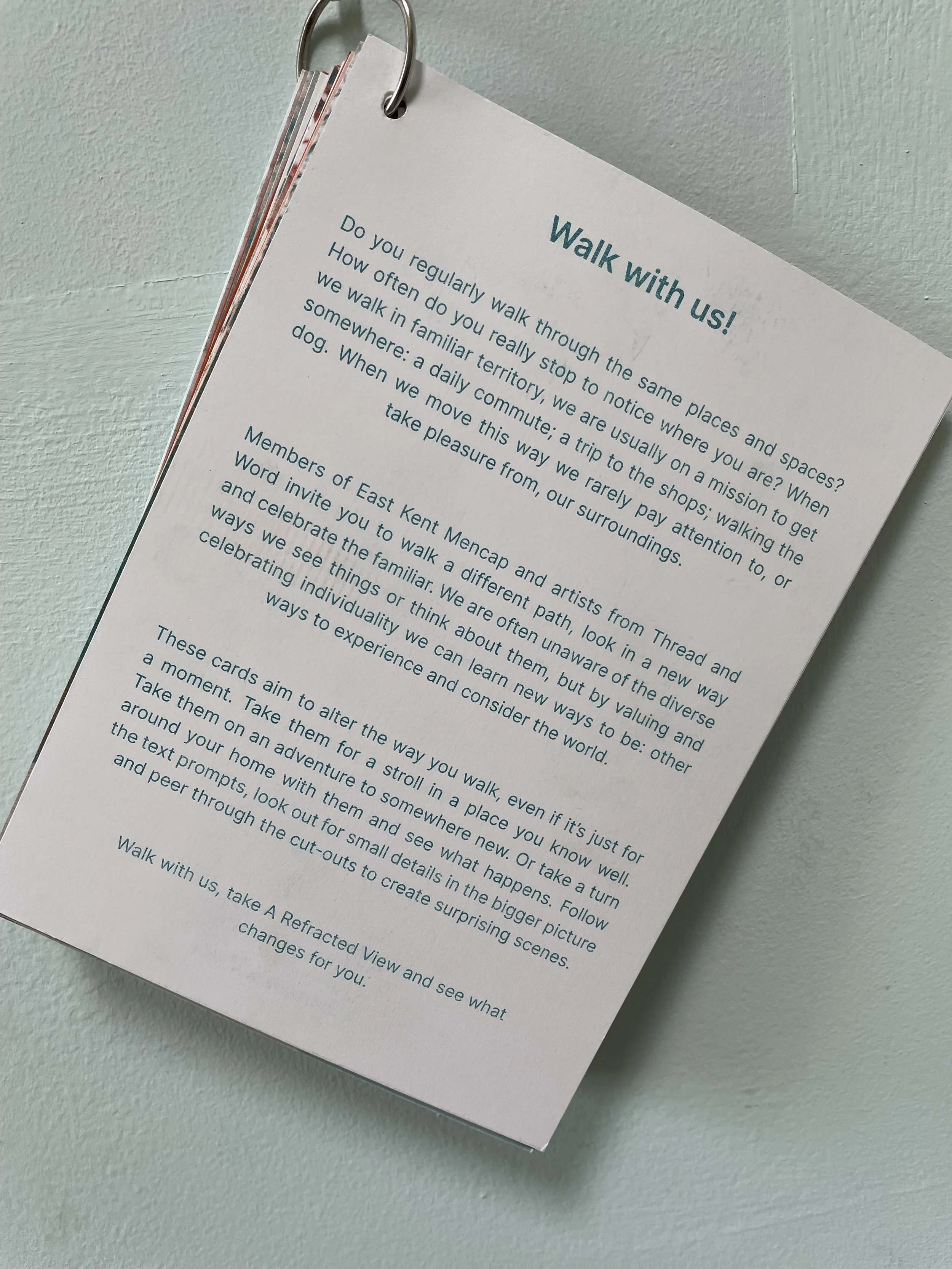 A Refracted View is a project delivered through Thread and Word artists in collaboration with members from East Kent Mencap. You can share in our creative journey through our recorded podcast and online exhibition. https://linktr.ee/ThreadandWord. We have created a full Drift Deck of 32 cards with walking prompts.The cards and prompts are part of a limited edition print of 40 sets. These have been created with the Members from East Kent Mencap who are adults with learning difficulties.